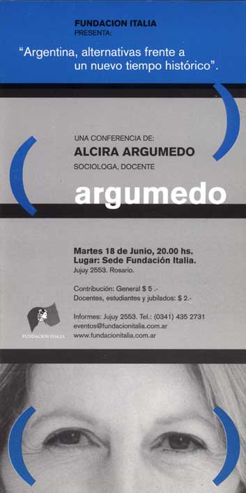 La socióloga rosarina sabe que la pregunta del millón es cómo construir el instrumento político que permita tomar medidas de alto impacto, a contramano de los dictados de los sectores de poder económico. Para eso confía plenamente en los nuevos actores políticos que están naciendo, y por lo mismo descree de la alternativa electoral que encarna Elisa Carrió, «La respeto mucho en su papel de fiscal, respeto su inteligencia, su coraje, su buen discurso. Pero me parece una forma de construcción política que está repitiendo viejos vicios, creemos que hay que generar nuevos elementos y no reciclar a la misma gente.