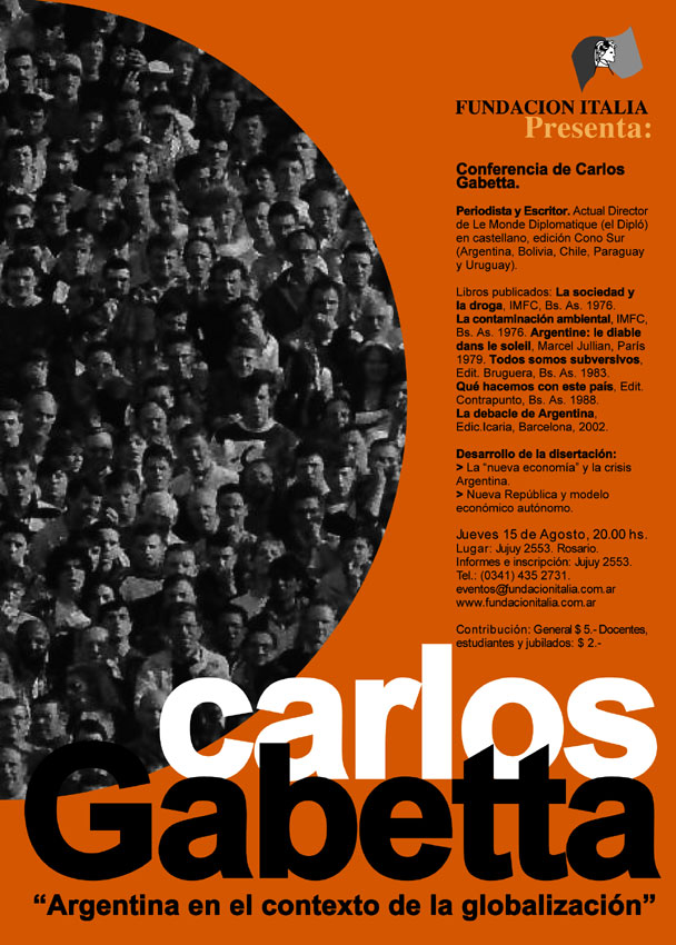 La observación de la realidad política y social es el eje central del trabajo de Carlos Gabetta, el director de la edicion local de Le Monde Diplomatique. Por eso con su sola presencia en Rosario despertó el interés de la gran cantidad de rosarinos interesados en entender el desconcertante contexto político Argentino. El publico colmo el salón de la Fundación Italia que lo trajo a disertar sobre «La Argentina en el contexto de la Globalización» . «Parezco una compañia de radioteatro de los años 50. En las ultimas cuatro semanas estuve en lugares tan distintos como Salta, Mendoza, Trelew y Rosario, con personas que se reúnen no para escuchar a alguien que les cuente como vamos a resolver el problema, porque yo no tengo ninguna solución apunto Gabetta antes de iniciar la charla-. Lo que tengo es una profesión que ha estado volcada a esto, así como si tuviéramos un problema quirúrgico estariamos hablando con médicos, bueno hablemos con politologos y economistas porque nuestros problemas son de la política y la economía».
