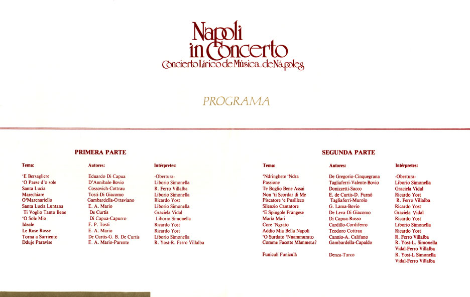 Versión de concierto lírico de la música popular napolitana. Se logró ofrecer un espectáculo con canciones que constituyen la expresión de una de las regiones más ricas del folklore italiano y que exceden los límites temporales y geográficos del lugar donde fueron concebidas.